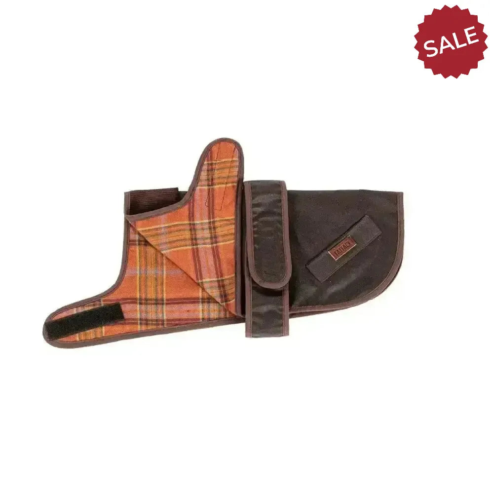 This chocolate coloured coat is packed with heaps of great features for furry friends. Made with waxed cotton, for a naturally water resistant outer and a cosy check burnt orange lining for warmth. The cord-lined collar can sit up or down to offer increased protection depending on the weather and is complete with adjustable Velcro fastenings around the neck and middle. FatFace cotton products support more sustainable cotton farming.