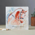 Featuring an original hand-painted watercolour design of a competition horse which is enhanced with a marble background with a unique die-cut edging. Designed to wish a Happy Birthday. Blank inside for your own message. Individually cello wrapped.