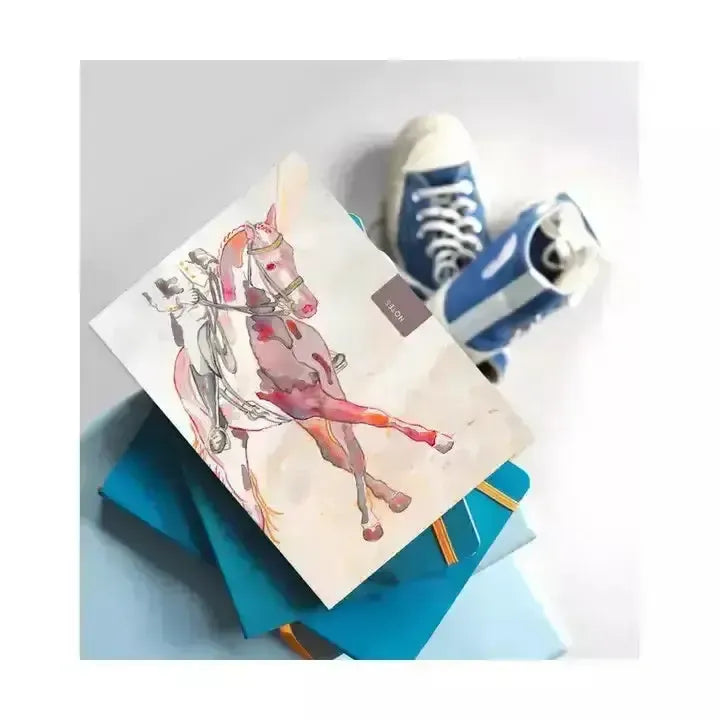 Handy A6 pocket sized notebooks! Anywhere your iphone fits, so can your notebook! Pockets, purses, even in leggings pockets too. Inside back cover has a section where you can keep your pin codes and passwords safe to hand! Hand-painted illustration, featuring an original dressage horse in half-pass watercolour design. A6 105×148, stapled and lined inside. Proudly made in Great Britain. Sold in x6 units per design. Banded in 6’s, and bagged with an outer cello.