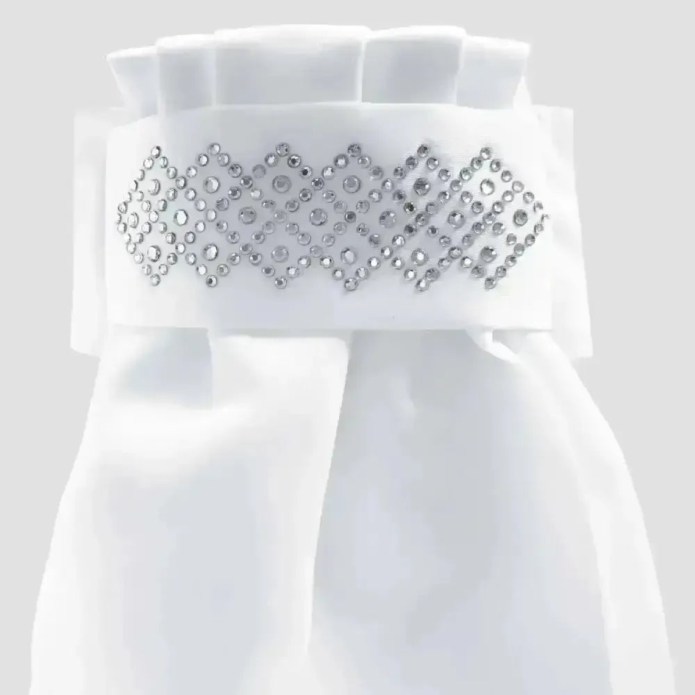Equetech Ready-Tied Stocks Solitair is an exquisite hand-made show stock with a plain band across the top heavily patterned with silver crystal diamond shapes with gathered ruffles at the top. This Ready-Tied Stock is perfect for that finishing touch in the show ring and is super easy to put on with a velcro fastening at the back. Best used with a show shirt.