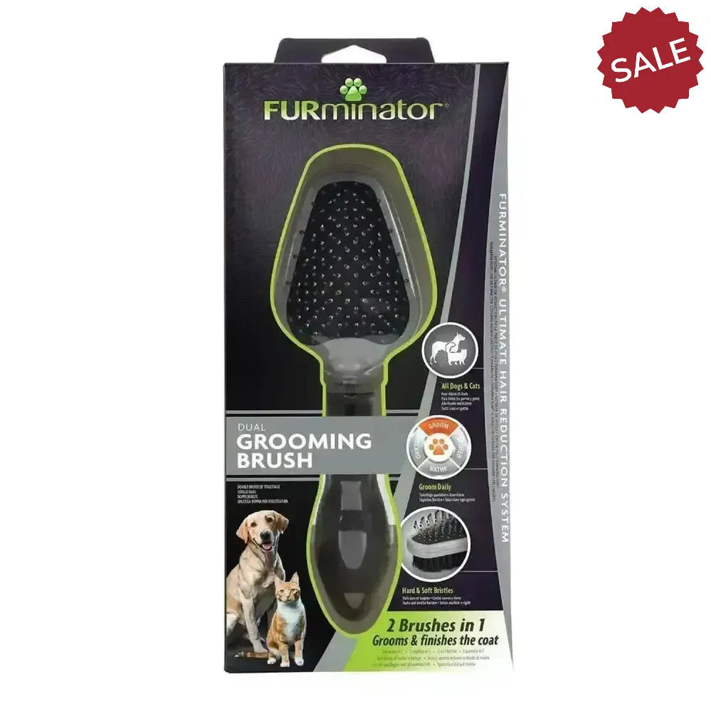 The FURminator® Dual Grooming Brush gives you two brushes in one. Metal bristles on one side remove loose topcoat hair, tangles and debris while massaging your pet's skin. Soft boar's hair bristles on the other side smooth and shine the coat. This brush provides a convenient daily solution for topcoat care on both dogs and cats. Brushing daily smooths, shines, reduces tangles and promotes a healthy coat. For best results, use with other FURminator® grooming products as part of a complete regimen.