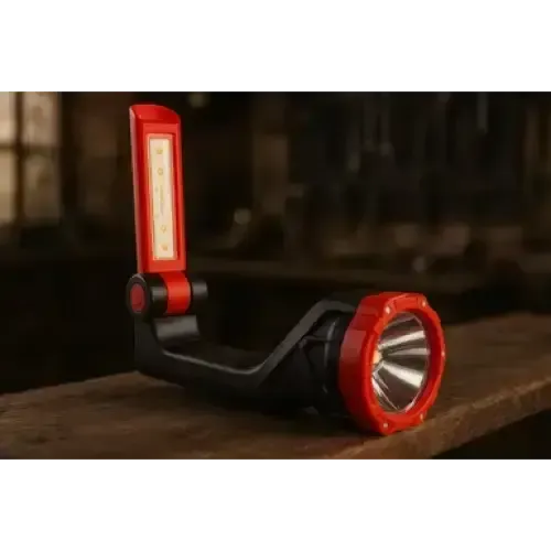 Explorer multi-functional torch, rechargeable with solar charging function. Features a twin level main beam and fold up work light.