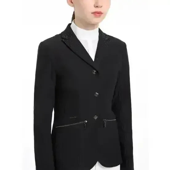 Our signature LeMieux premium show jacket, scaled for young riders. Built for competition, it has perforated side vents lined with performance air mesh for comfort and breathability. Sophisticated crystal details on the collar, back belt and split tail tips give a sophisticated edge, while subtle LeMieux branded finishing touches on the hip and arm convey quiet confidence. Generous side zip pockets and a durable front zip with distinctive LeMieux branded poppers lend practicality to this show-stopping jacket.