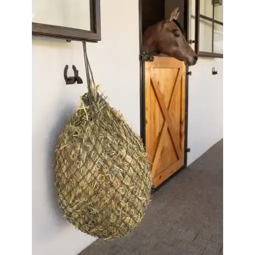 Slow down greedy feeders with this high-quality haynet.Metal rings and robust hanging rope make it a durable choice. This single-layer haynet has smaller holes, perfect for slowing down greedy feeders for better digestion - also preventing wasted hay from falling to the floor or mixing into bedding.Holds approx 6kg of dry hay.