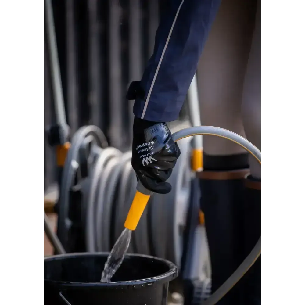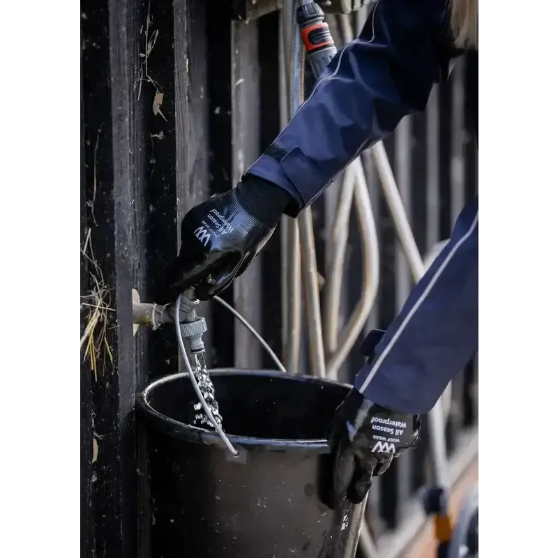 The All Season Waterproof Yard Glove is the perfect year-round glove for all types of work. Made with a durable nitrile coating, the glove is waterproof and designed to maintain a strong grip in both wet and dry conditions. The nitrile material ensures superior protection against water, oils, and dirt, while offering flexibility and comfort. This glove is perfect for equestrians who need a dependable, all-weather glove for daily tasks in the stable or out in the field.